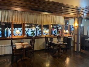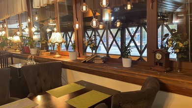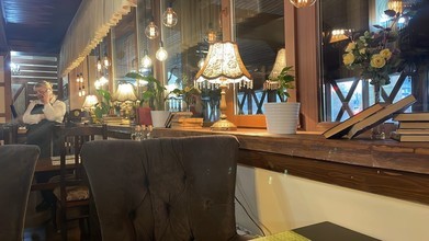 По-домашнему уютный интерьер просторного зала располагает к душевным посиделкам с семьей или друзьями: зеленые растения в горшках, книги, абажуры, лёгкие занавески на окнах. Гости могут расположиться за удобными столиками на стульях или мягких креслах.